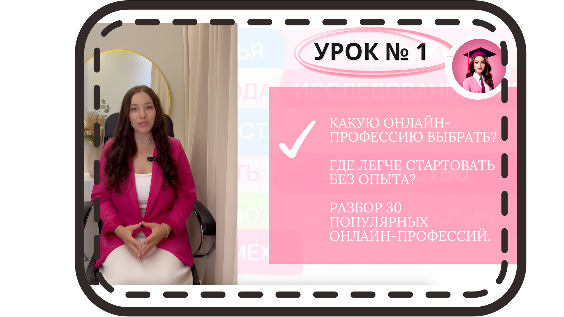 На вводном занятии ты увидишь реальные плюсы онлайн-работы, разберёшься со своими страхами и поймёшь, как идти вперёд маленькими шагами. Это первый шаг к новой жизни, где работа подстраивается под тебя, а не наоборот