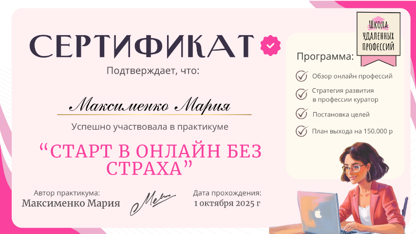 По окончании онлайн-практикума ты получишь именной сертификат, который в разы увеличит твои шансы получить приглашение на стажировку